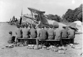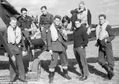 father, especially Ratcliff and Harvie who acted like public school boys.  Henry Hind was not a snob and considered the most talented pilot in the squad. (His father was someone high up in the Air Ministry.) Harry McDonald was an odd-ball loner, tall and gaunt, who spoke  like an Englishman but came from a middle-class background in Glasgow.  In the photograph he stands stiffly next to my father with a pale face and eyes shut, an uncanny premonition of things to come.