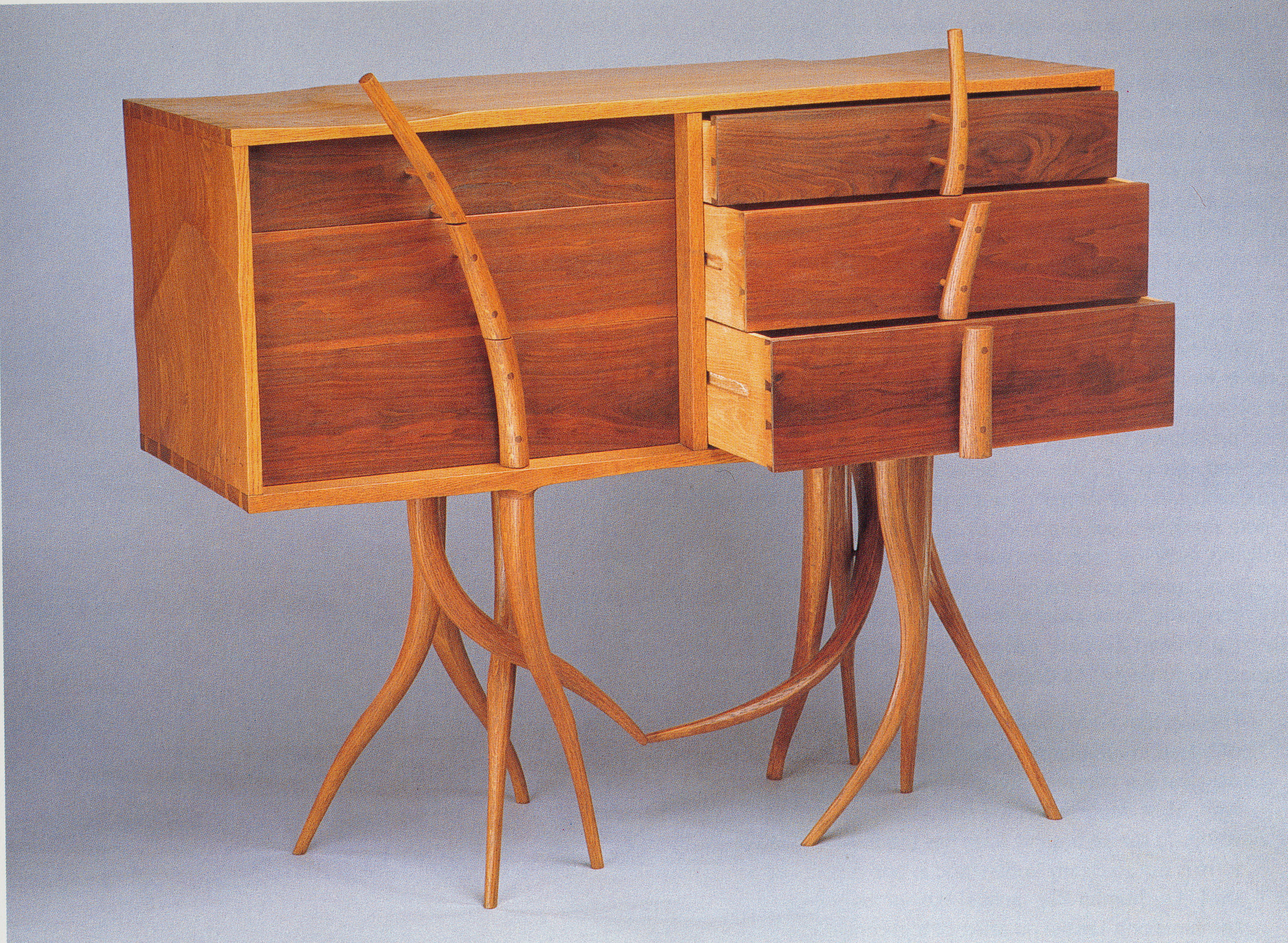 for the drawers. By the mid-1960s the work began to bulk up with oak and walnut lamination that sprouted outward like hollow gourds. A cherry-wood blanket chest from 1963 was plump and expectant but also mysterious and withholding, the very opposite of those lanky, anorexic stools he’d been making three years earlier. It might have been a ripened cherry or a “fantastic species of giant seedpod,” as one critic described it, perched on a bulbous base and could be opened by pushing a three-fingered handle sprouting, oddly, from the top.