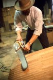 studio. Walls are white and floors a pale concrete strewn with wood shavings. Ideas flow freely here. Large drawings are tacked to boards showing future projects, simple outlines drawn in Magic Marker. Benches are covered with chisels and mallets, spoke shaves, small-scale models made from clay or foam, and clamps in every size and shape, hundreds of clamps. There are drill presses, long-bed jointers and a monstrous L. Powers band saw made for building ships. Castle moves about easily, shifting an unfinished piece of furniture, touching one of the hydraulic chisels, and despite the silver hair, he seems like a much younger man, trim and fit from carving and lifting heavy slabs of lumber. He stops and stands for a moment as if about to say something, but then moves on silently. There’s no particular sense of urgency. He employs six full-time
