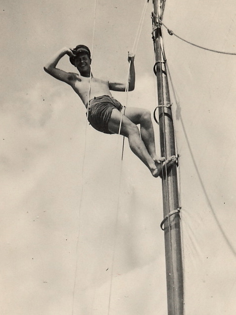 Bdev 86_0016_NEWPhotographs from that summer look like stills from a silent movie. My father appears to be suspended in space, a happy marionette, in watery reflections and soft, billowing clouds, either dangling from a spar or balanced precariously on a bowsprit. There are no backgrounds, no recognizable features of landscape, just water and the hazy skies of western Scotland, the islands of Jura, Coll, Islay, Mull, and the blurred outlines of distant hills. He turned twenty-three on May 31, 1939, poor as a church mouse, but free to do whatever he liked, go wherever he liked. He rented rooms on Gare Loch and was as happy as he’d ever been, sailing the Clyde and swimming, reading Aeschylus in the original Greek with English annotations by Gilbert Murray, sitting up in his garret with an oil lamp flickering while unseen forces were already at work, plotting and reshaping his future.Through a small side window he could see the ships of the Royal Navy moored at the Tail O’ the Bank, making the words of Aeschylus seem all the more prescient: “Deep in that shingle strand, moored the sloops of war, and men thronged the beach of Ilium…” as if it were lifted from the front page of the Glasgow Herald but filtered through an ancient, amber lens.