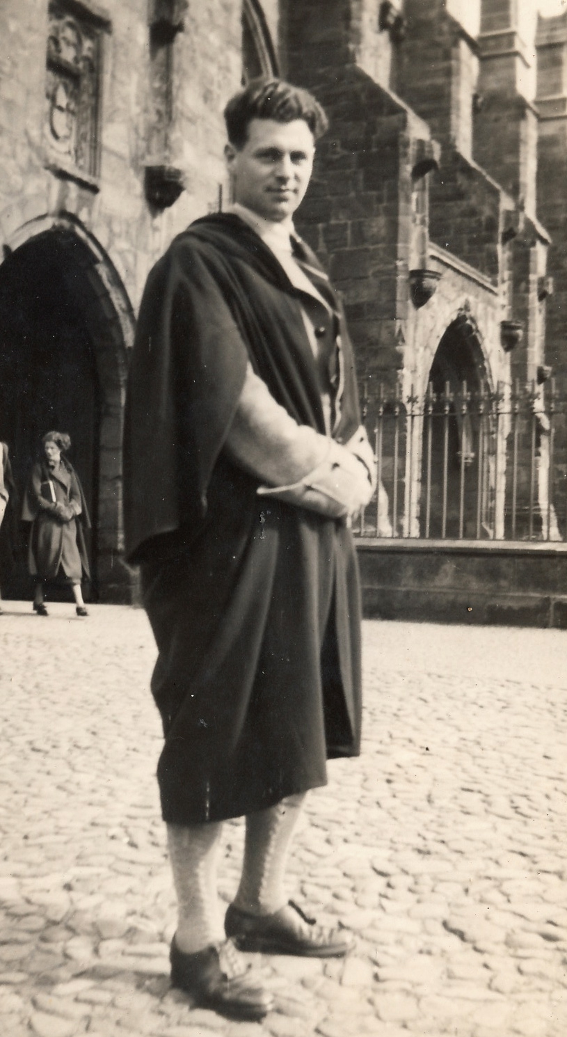 Earlier in the week I drove east across the narrow waist of Scotland, doubling back through industrial hinterlands, with black smoke rising over Royston and Wallacewell, through the flatlands of Castlecary to Queensferry, across the Firth of Forth Bridge and up the east coast to Fife. After his “mishap” in the RAF–the crumpled plane, the broken collar bone–my father returned to the comforts and relative safety of student life, this time at St. Andrews, Scotland’s oldest university where he studied from September 1937 to May ****College, St. Andrews 21939 at St. Salvador’s College on North Street with its high tower and courtyard shaded by the venerable thorn tree that Mary Queen of Scots is said to have planted. He took Introductory Hebrew with Sandy Honeyman, the youngest professor at St. Andrews. He sat in a drafty lecture hall and listened to T. Malcolm Knox, a prominent