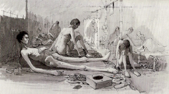 Then there were the drawings, the hurried charcoal sketches and ink renderings scratched onto paper with a bamboo nib. These were as disturbing as the photographs, maybe even worse. Drawing was strictly forbidden in the camps, so the renderings were done in haste and then, just as quickly, concealed. Philip Meninsky was caught doing a caricature of a Japanese officer at Tarsau and beaten senseless, close to death. It was an act of resistance, and perhaps it was the fear, the sense of defiance, that made the images so urgent and, in some ways, closer to reality than the photographs. Unnecessary details–facial features, fingers and hair–were left out, and this made for a raw kind of expressionism made up of bold gestures and elementary forms.