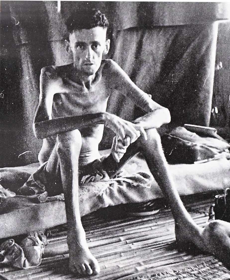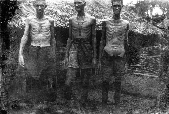 Being caught with any kind of camera brought severe punishment; often death, and many of the images in my father’s slide show were shot at great personal risk. George Aspinall, a young Australian POW, concealed a folding Kodak 2 camera throughout his period of captivity. He used single strips of X-ray film that he’d stolen from a warehouse in Singapore and learned how to process the negatives himself, in the middle of the night, pouring fixative into bamboo containers, rinsing the negatives in a stream near the camp. (Aspinall’s most iconic photograph shows three human scarecrows standing in front of the medical tent at Shimo Songkurai).